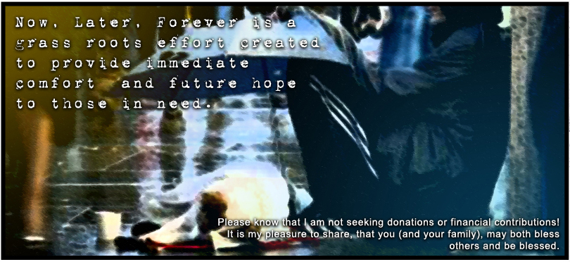 Now, Later, Forever is a fun, easy and affordable way to show compassion and provide immediate relief (directly at the point of need), in a meaningful way without the concern of giving cash that could be spent inappropriately. Lasting physical comfort is included in the form of hand warmers or cool packs, and the promise of a future meal. Most importantly, The promise of God’s love will plant the seeds for life everlasting and the unexpected brief moments of personal interaction are priceless to a person who is “embarrassed” and accustom to being shunned.